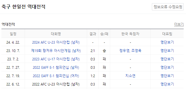 한일전 역대 전적으로 최근 23년 10월 7일 아시안게임에서 2:1로 승리한 바가 있으나, 이번 경기는 U-23 경기로 대표팀 명단이 다릅니다.
